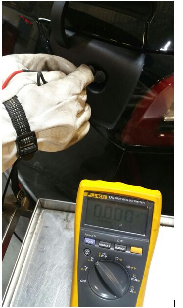 NoteMake sure to wear PPE (HV gloves, safety glasses) when working on high voltage components, Measure B+ to B-, B- to Ground, and B+ to Ground (use rear left door striker as a ground for the isolation check), If voltage is greater than 10V, Pack contactors are not open or welded, Stop work and reach out to Service Engineering