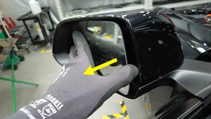 NoteWhen aligned correctly, the metal tab on the door mirror glass goes the top right of the door mirror assembly.CAUTIONTake care not to damage component(s).WarningThe video(s) included in this procedure are meant as an overview for supplemental purposes only. Follow all of the steps listed in the procedure to avoid damage to components and/or personal injury.