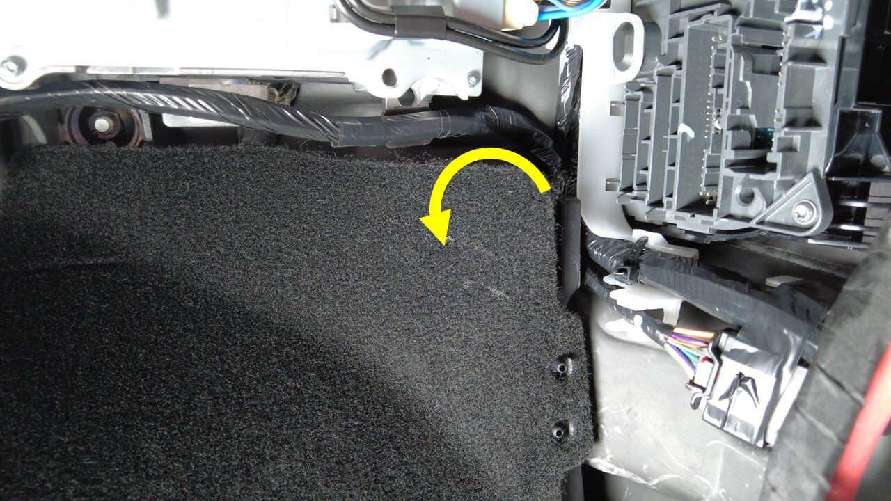 Note4x clips, 2x guide tabs, Pull rear of lower A-pillar upward to release clip then pull rearward to release front tabs from carpet
