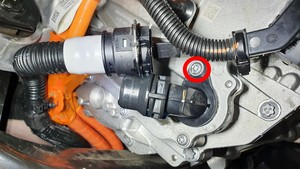 connect the rear drive unit inverter inlet tube to the 55 degree fluid