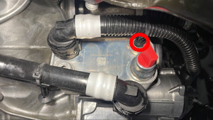 Release the clips (x2) that attach the PT outlet hose to the heat exchanger, and plug