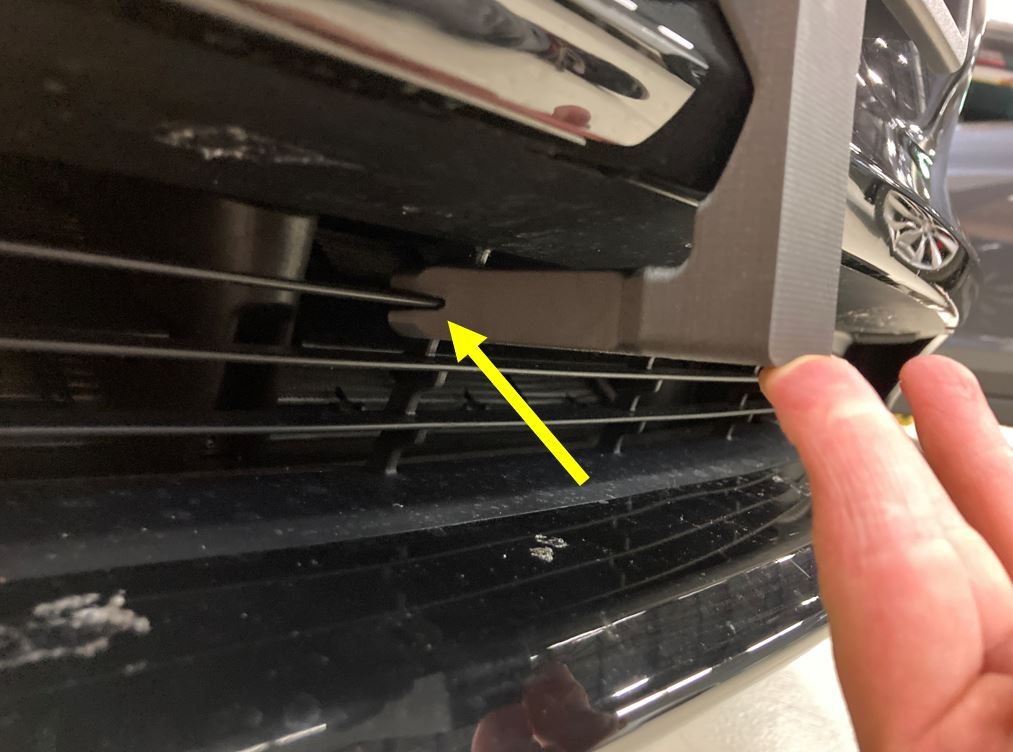 NoteApply enough force on the head of the jig causing an even contact surface with the front fascia grille and the front license plate bracket.NoteMake sure to hold the jig by placing your hand on the head of the jig.