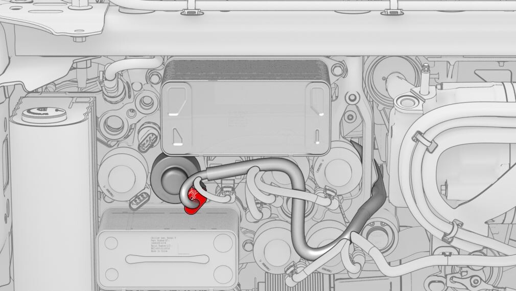 CAUTIONPush the red locking tab towards the connector to engage the locking mechanism. DO NOT push down or pull up on the red locking tab.NoteMatch the color of the tape wrapped around the harness with the color of the sheathe near the coolant hose coupling.