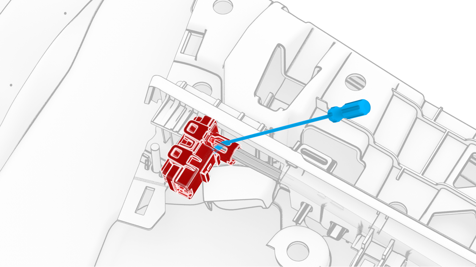 使用 45 度长凿松开将左后车门氛围灯模块固定到 LED 灯带上的锁片(2 个)和定位销,然后将氛围灯模块从车辆上拆下。