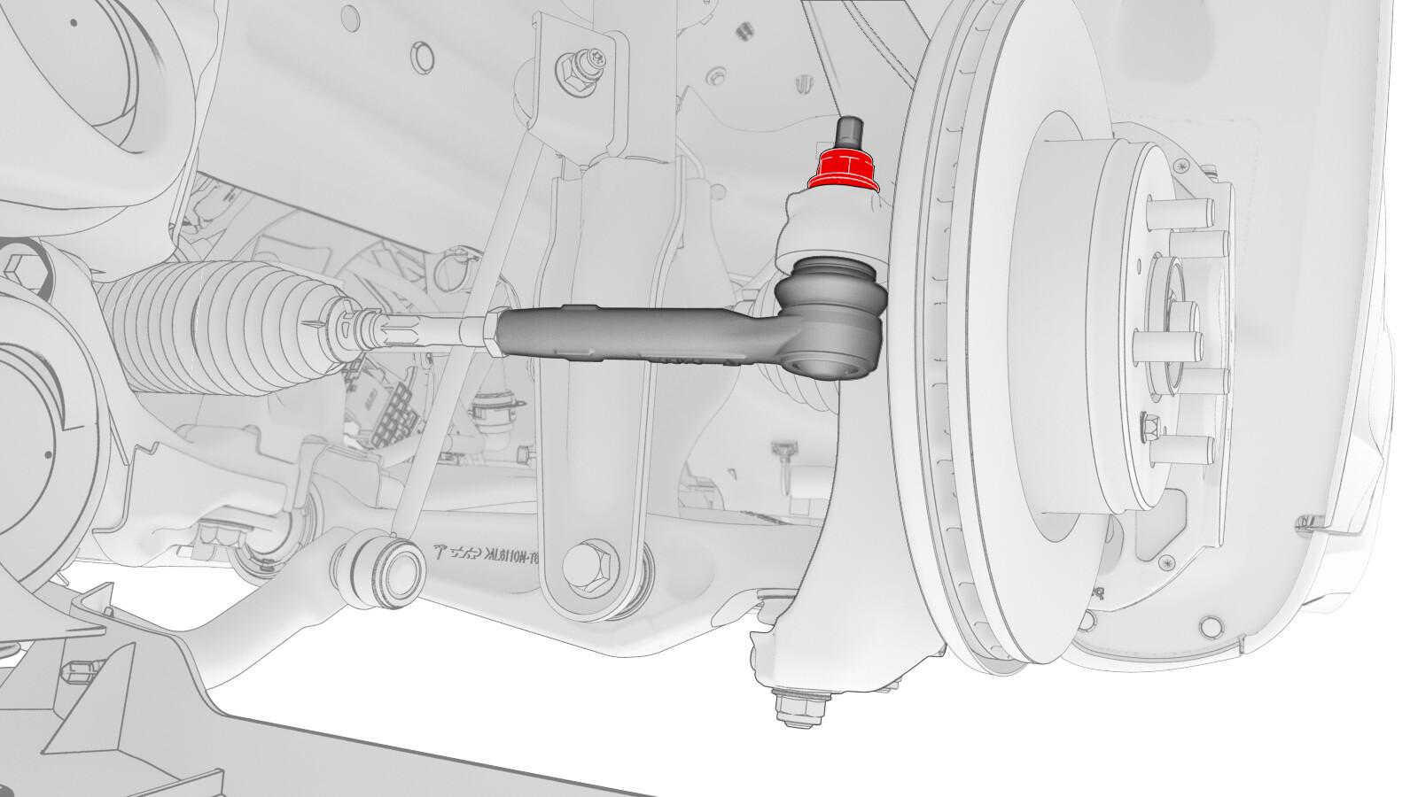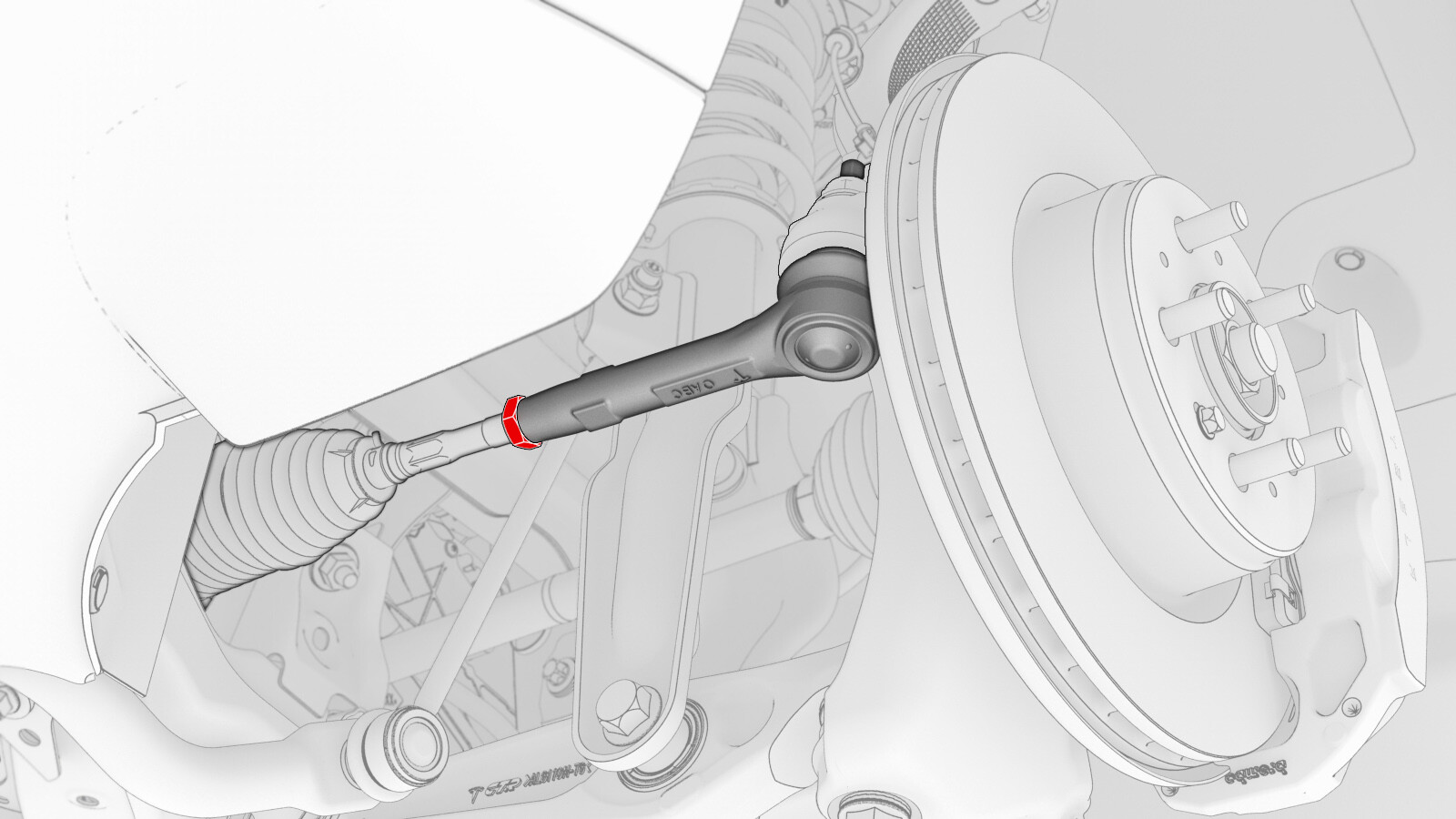 - 用油性记号笔在横拉杆和止动螺母上标出证示标记,以便稍后在 LH 横拉杆球头安装期间重新对齐两者。