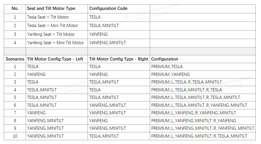 - 根据表中给出的倾斜电机总览信息更新cfg_frontSeattype。