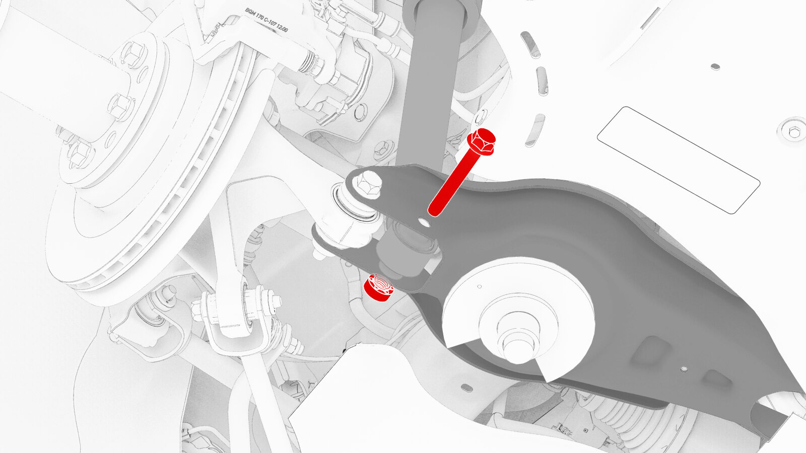 紧固将左后减震器固定到下尾连杆的螺栓和螺母,然后用油性记号笔标记螺栓和螺母。