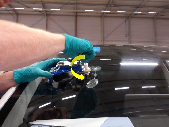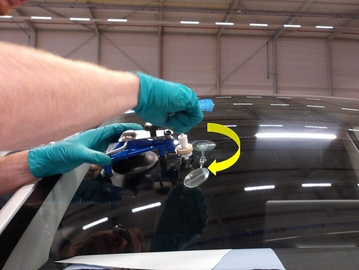 注Apply a thin layer of gel to the suction cup of the Bridge, and then place the Bridge on the outside of the windshield so that the injector head is positioned exactly over the repair area (impact point) and vertically to the windshield.