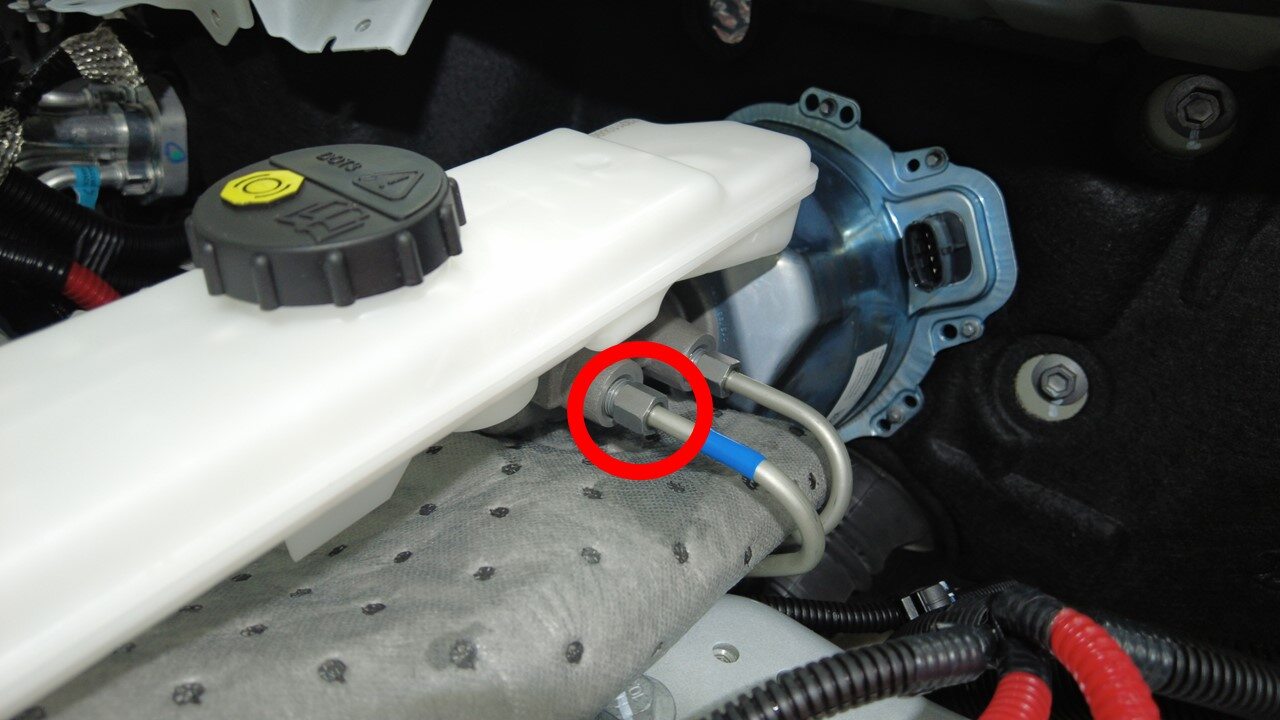 - 通过内侧排放阀冲洗左前制动钳,直至气泡明显减少。