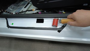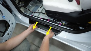 使用塑料饰板工具小心翘弯门槛板。粘合剂完全脱胶后,将门槛板拉出。