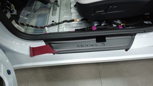 - 根据遮蔽胶带的标记,将新门槛板稳妥放置入位,然后下压,使其粘贴在车上。