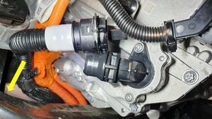 Remove the rear drive unit inverter inlet hose down and out from between the rear subframe and the HV battery.