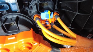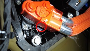 在充电接口处,使用 Hioki 电阻计测量充电接口母排引线与充电接口母排螺柱之间的电阻。另请对其他引线和螺柱执行该测试。
