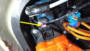 松开锁片,然后断开交流三相连接器与充电接口总成的连接。