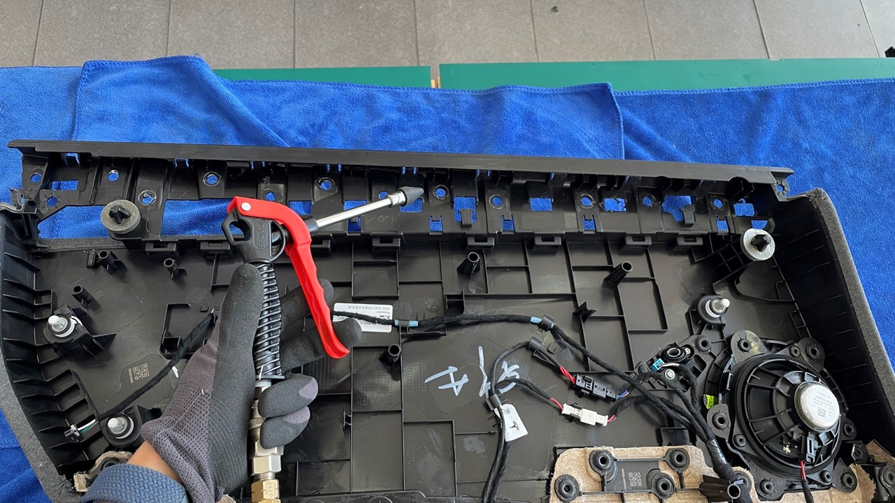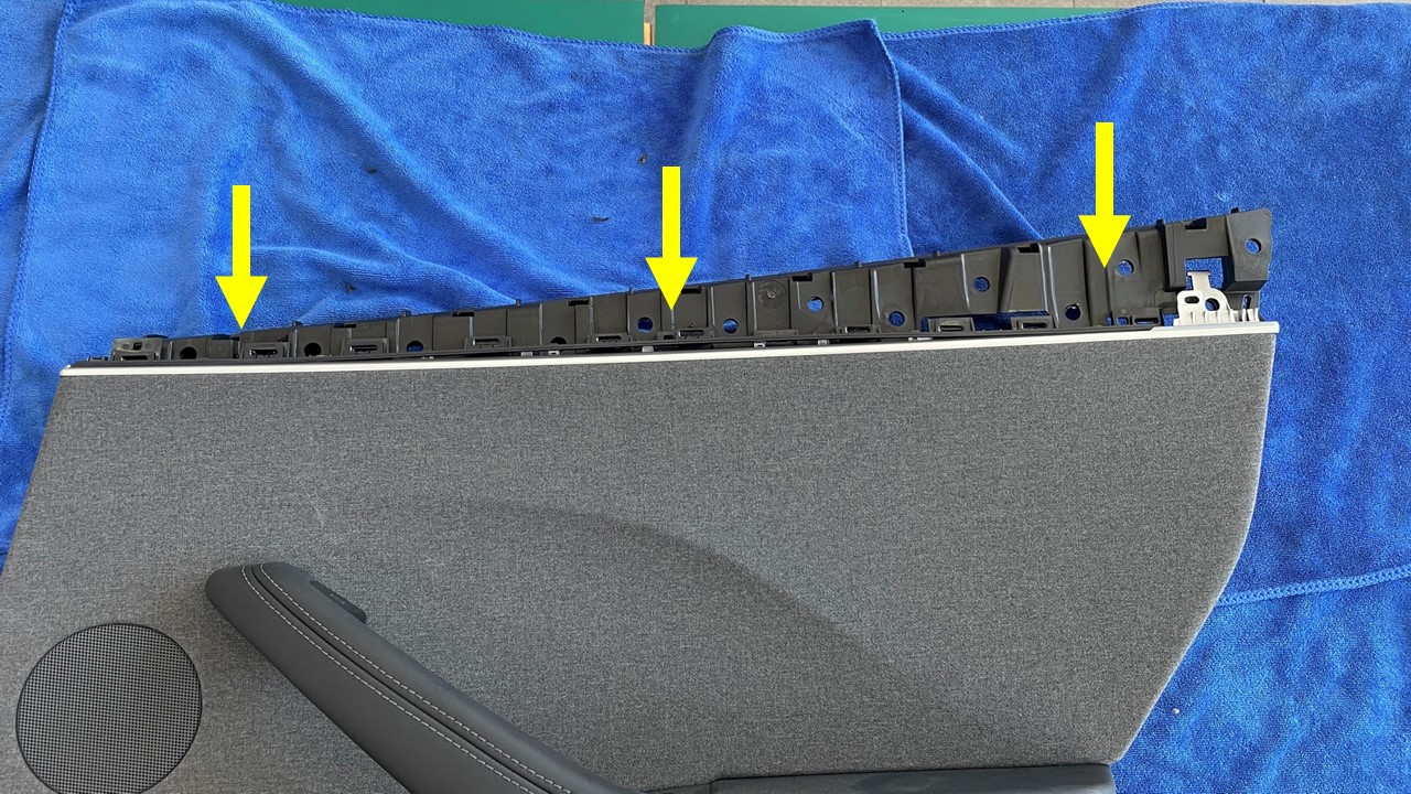 在协助下,将氛围灯亮条安装到左后车门板上。