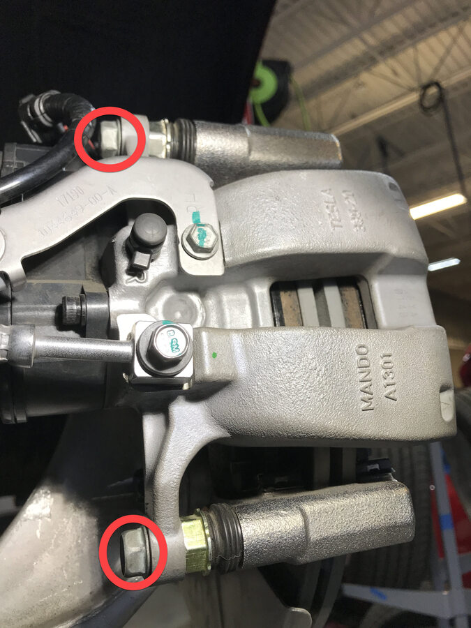 对于严重腐蚀的制动钳,气锤的快速振动有助于破坏腐蚀并松开卡在制动钳中的定位销和制动片。将气锤的钝凿尖对准定位销穿过制动片的位置。图 1. 图示为 Model S 制动钳,Model X、Model 3 和 Model Y 制动钳与之类似