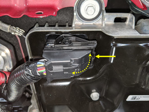 使用袖珍螺丝刀按住连接器锁片,然后向左推动锁片,将温度系统次级线束电气连接器从前车身控制器上断开。
