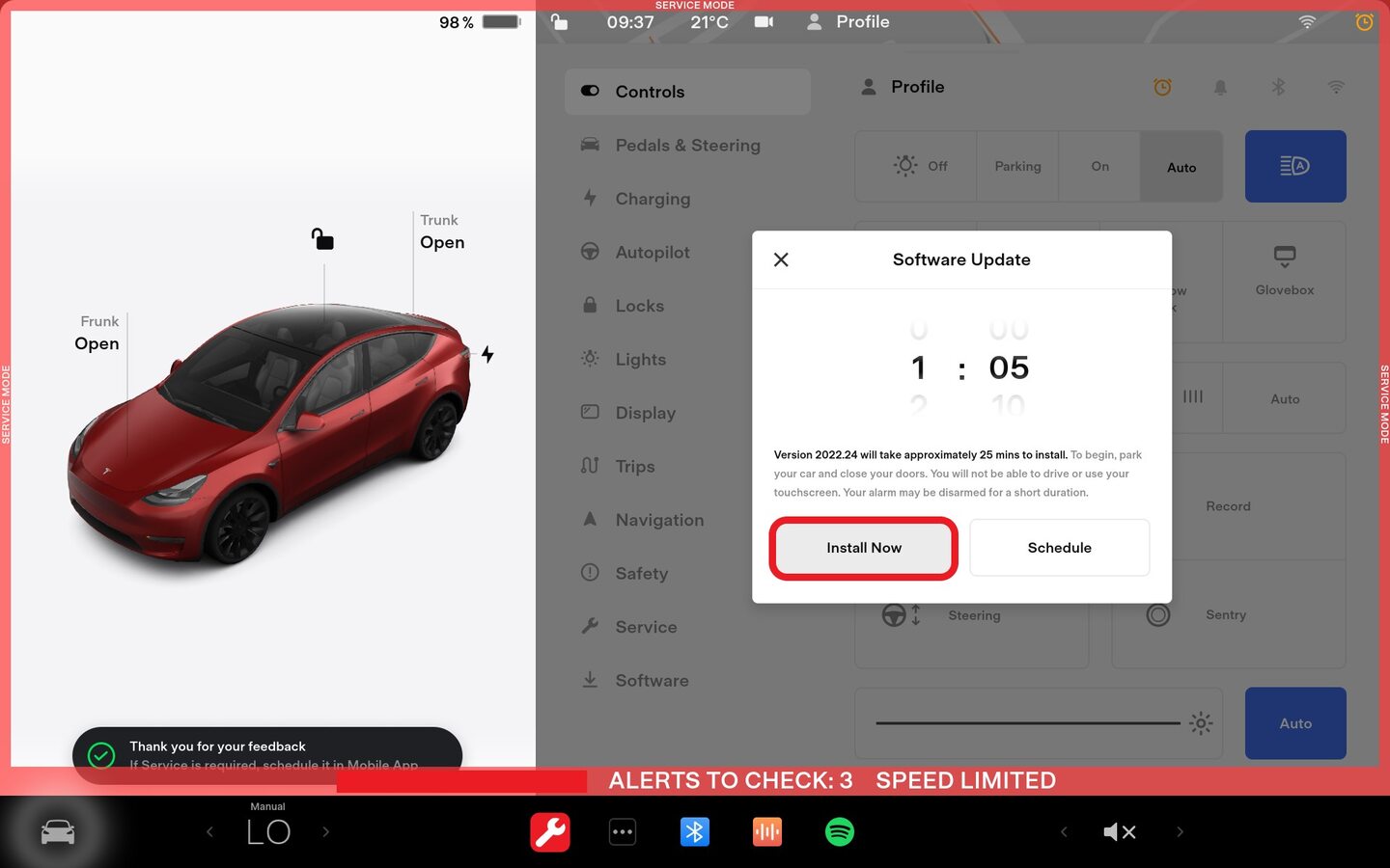 注选择中央显示器上的时钟,或点击“软件”选项卡,然后选择“现在安装”开始固件更新。选择 "Install Now";点击倒计时计时器,直至倒计时显示为 0;检查中央显示器,确保固件包正在安装。