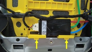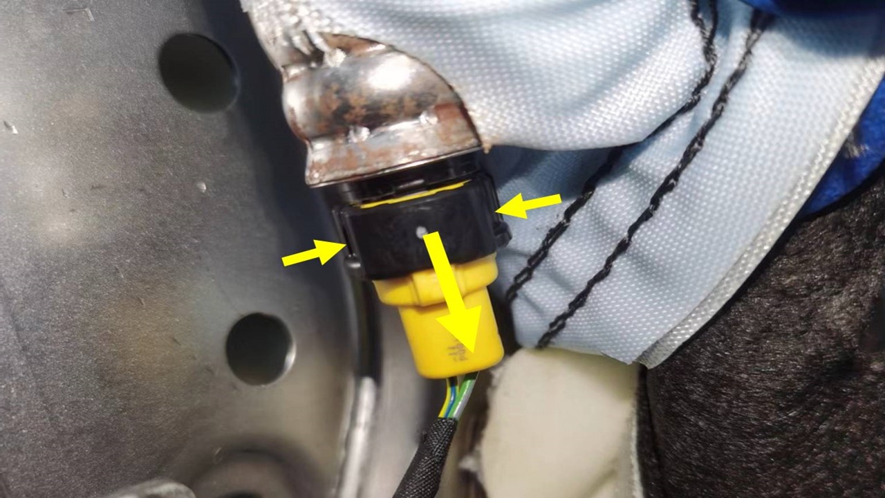 将座椅蒙皮拉离气囊,以便能够到电气连接器;然后向下按住连接器两侧的黑色锁片并向下拉动,以断开气囊电气连接器。