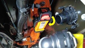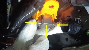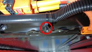 - 从高压电池右后侧下方取走冷却液排放容器。