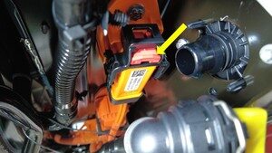 松开卡子,然后从高压电池磁盘外壳的右端断开高压电池右侧内部回流软管接头,并快速堵住内外接头。