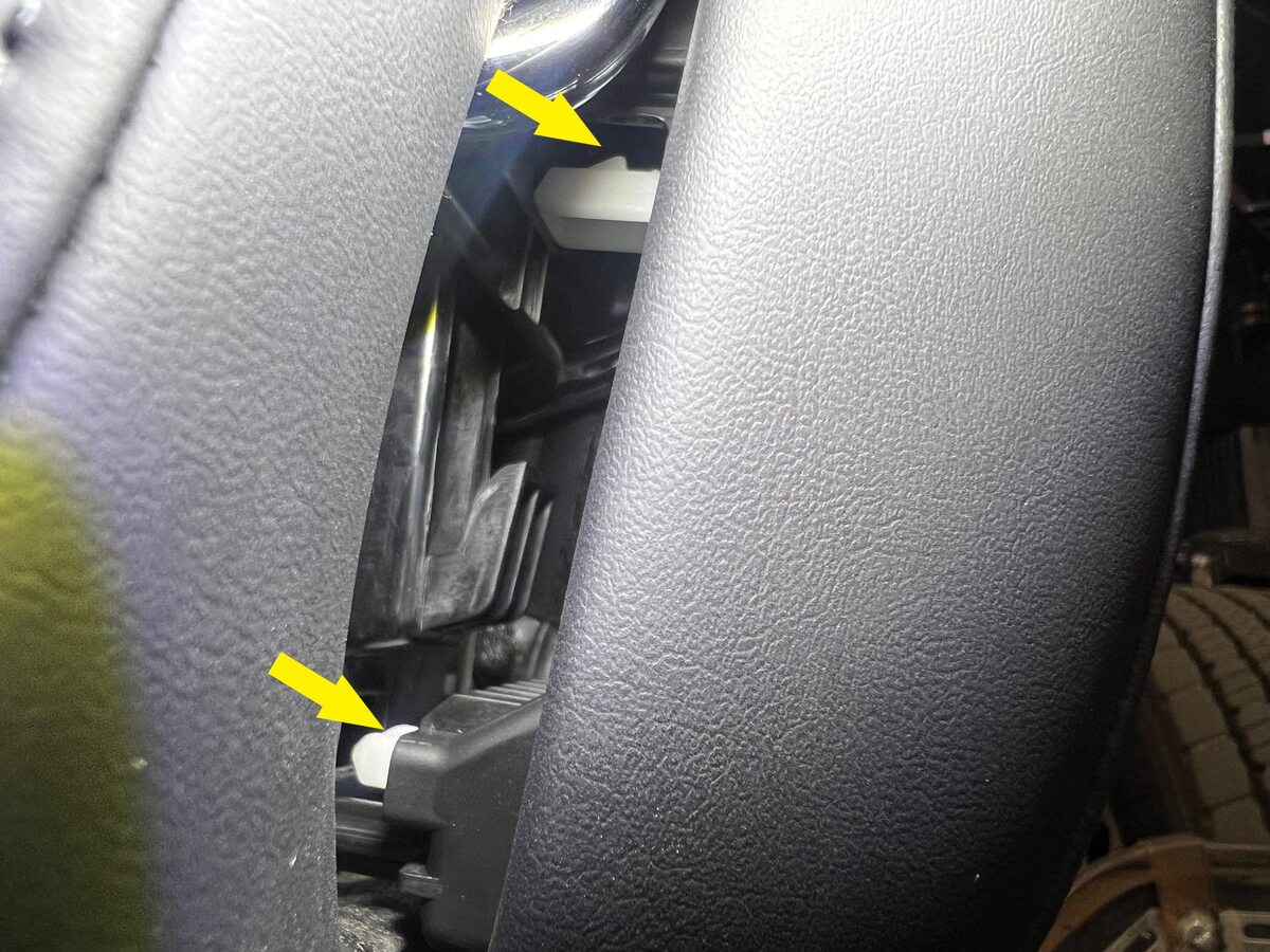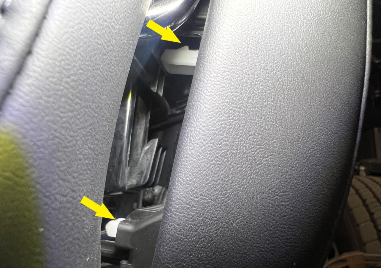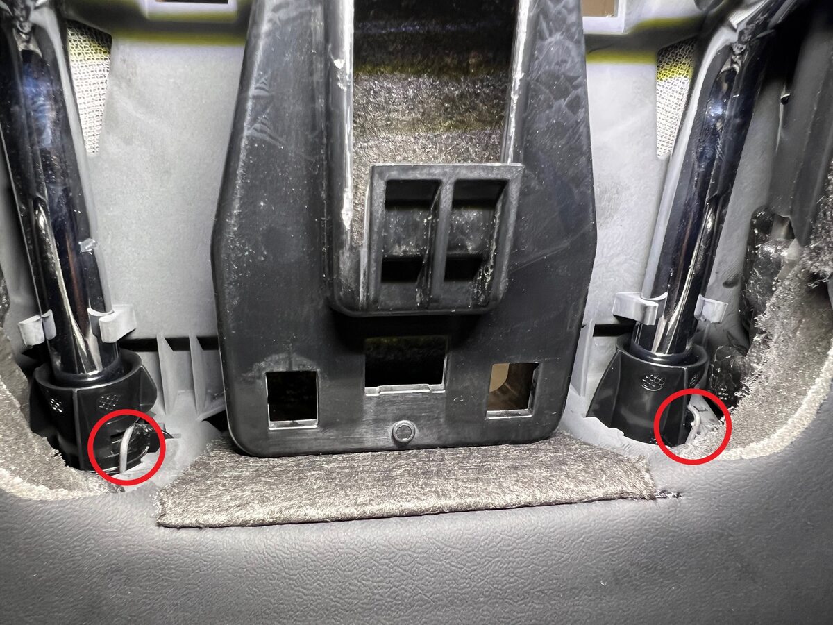 注2x locking clips, 2x toggle bolts, remove by pulling out then use plastic trim tool to release clips with toggle bolts, This will require extra force, Note: The clips and toggle bolts will need to be pulled out and are likely to break during removal, Discard headrest after removal