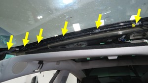 沿挡风玻璃顶部安装挡风玻璃线束,然后紧固将线束固定到挡风玻璃的卡子(6 个)。