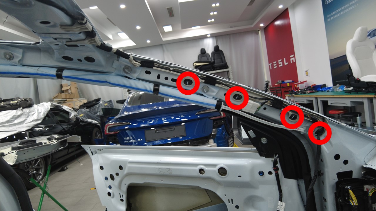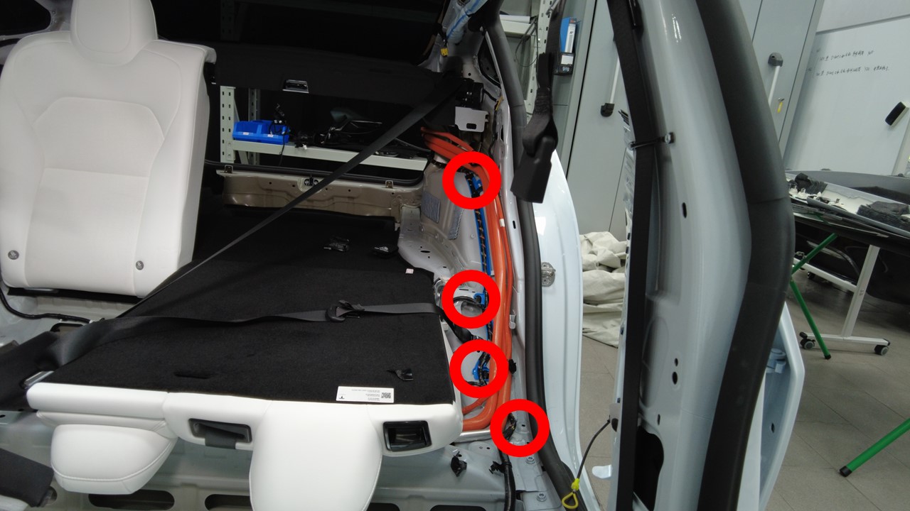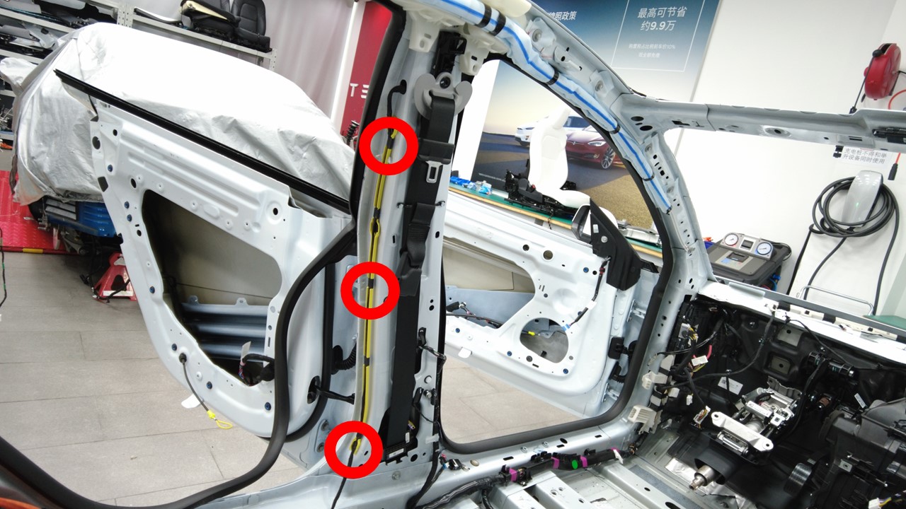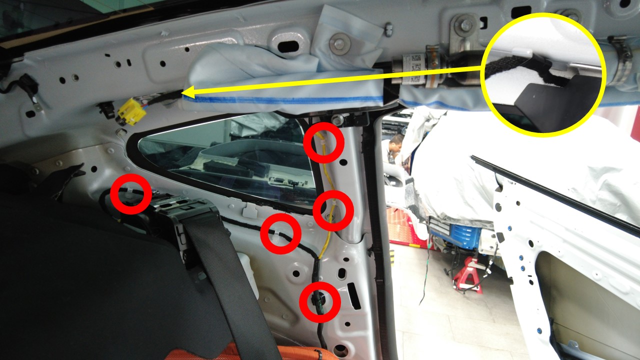 将左侧车身线束夹安装到左侧安全气帘和卷收器区域。