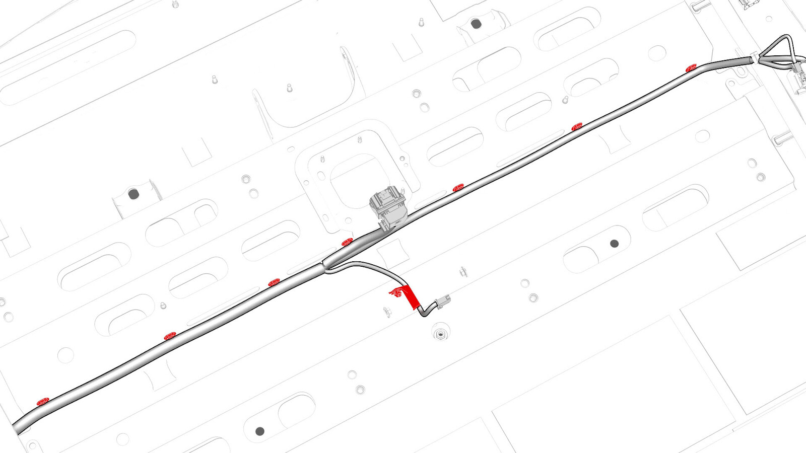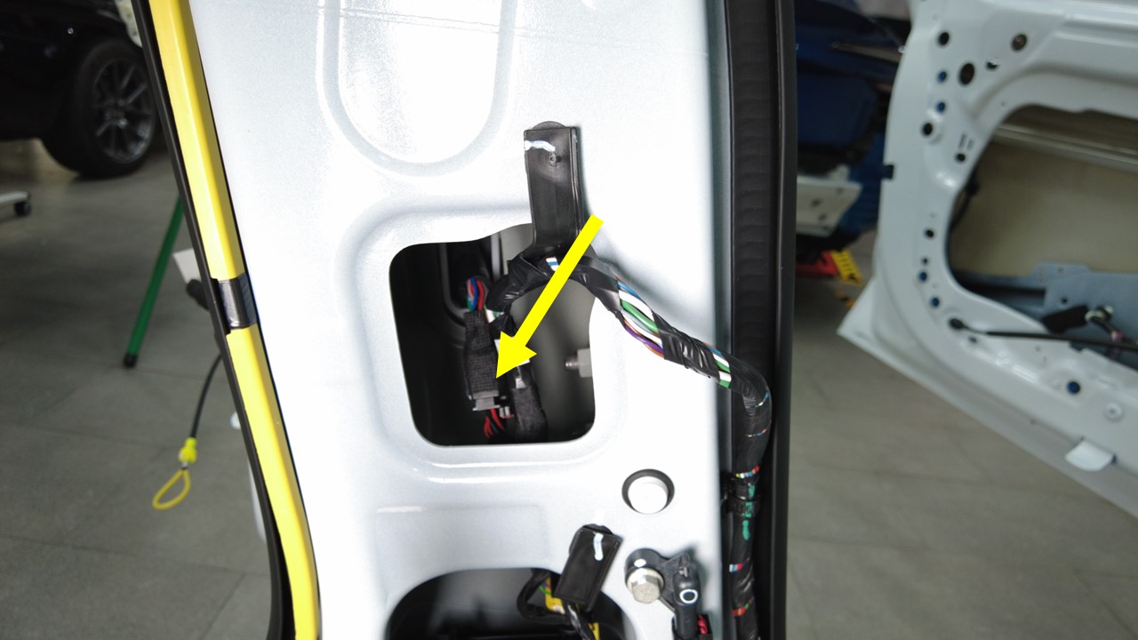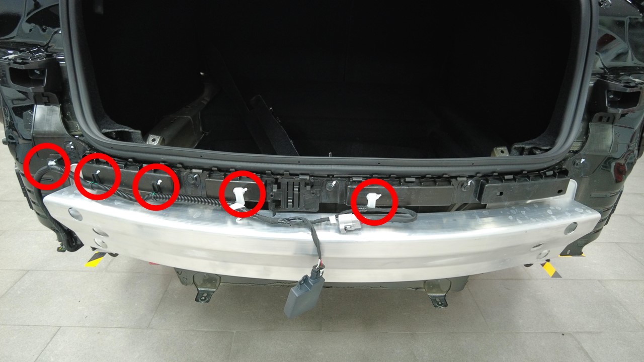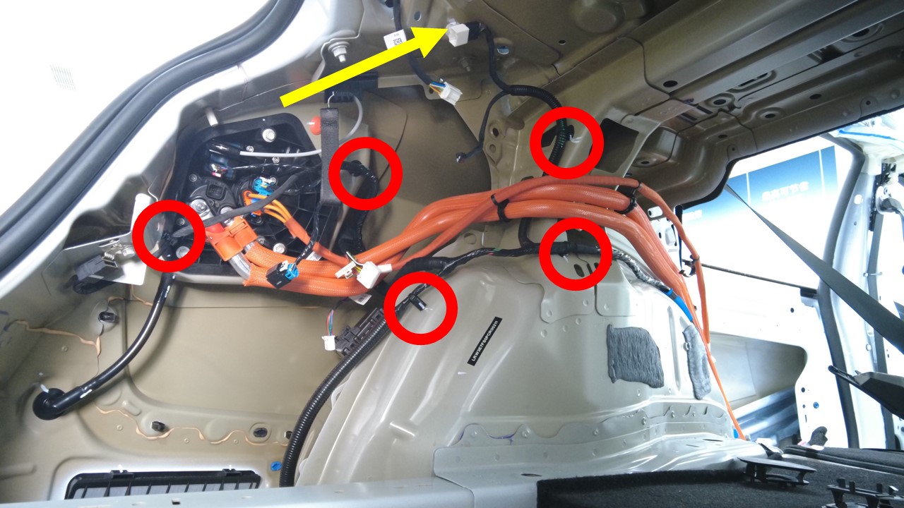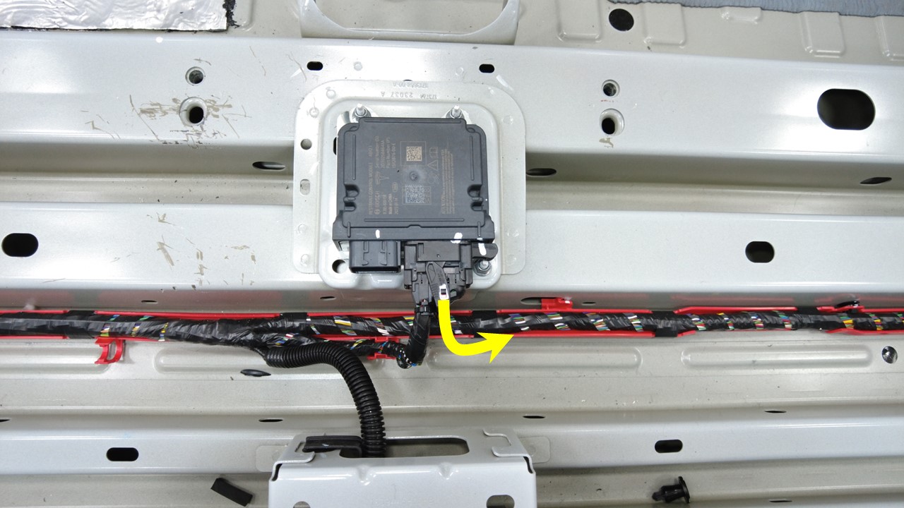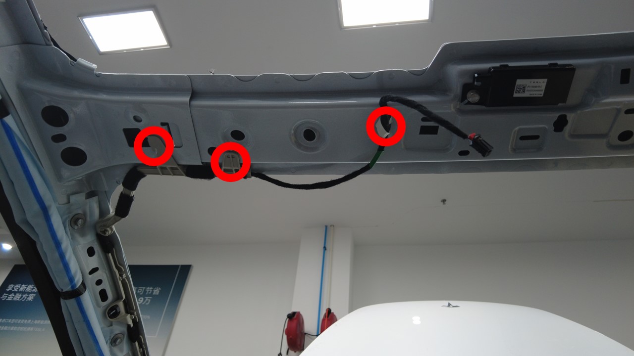 连接将电气线束固定到车身的夹子,然后将电气线束后副车架部分穿过左侧后备箱隔板。