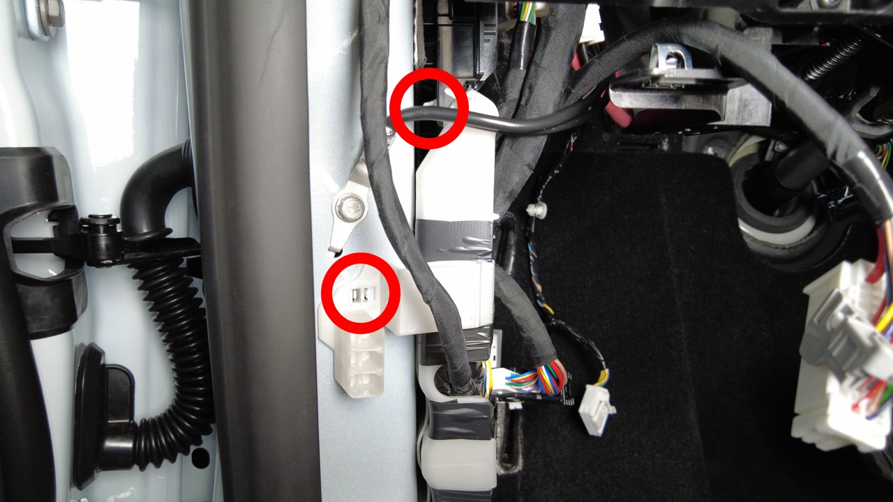 将连接器安装到安全控制器上,然后连接将左侧车身线束固定到左侧 A 柱至车身的夹子(9 个)。