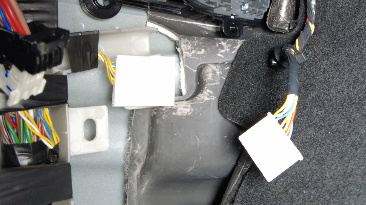 拆卸前排座椅和中控台下方的左侧线束夹,将左侧车身线束连接器从 B 柱外部区域处左后车门线束连接器上断开。