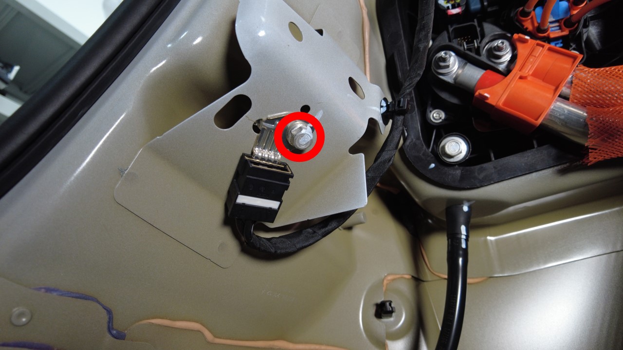 安装新的螺栓,将电气线束接地带固定到左侧 B 柱下部区域处车身。