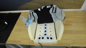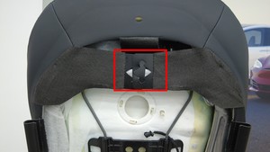 将第一排右侧座椅侧气囊安装到气囊滑槽中,然后将气囊滑槽连同其内部气囊一起插入座椅靠背泡沫上的凹槽中。