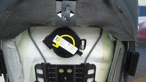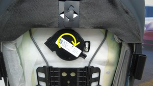 逆时针旋转第一排右侧座椅靠背通风扇,将其安装到泡沫垫上。