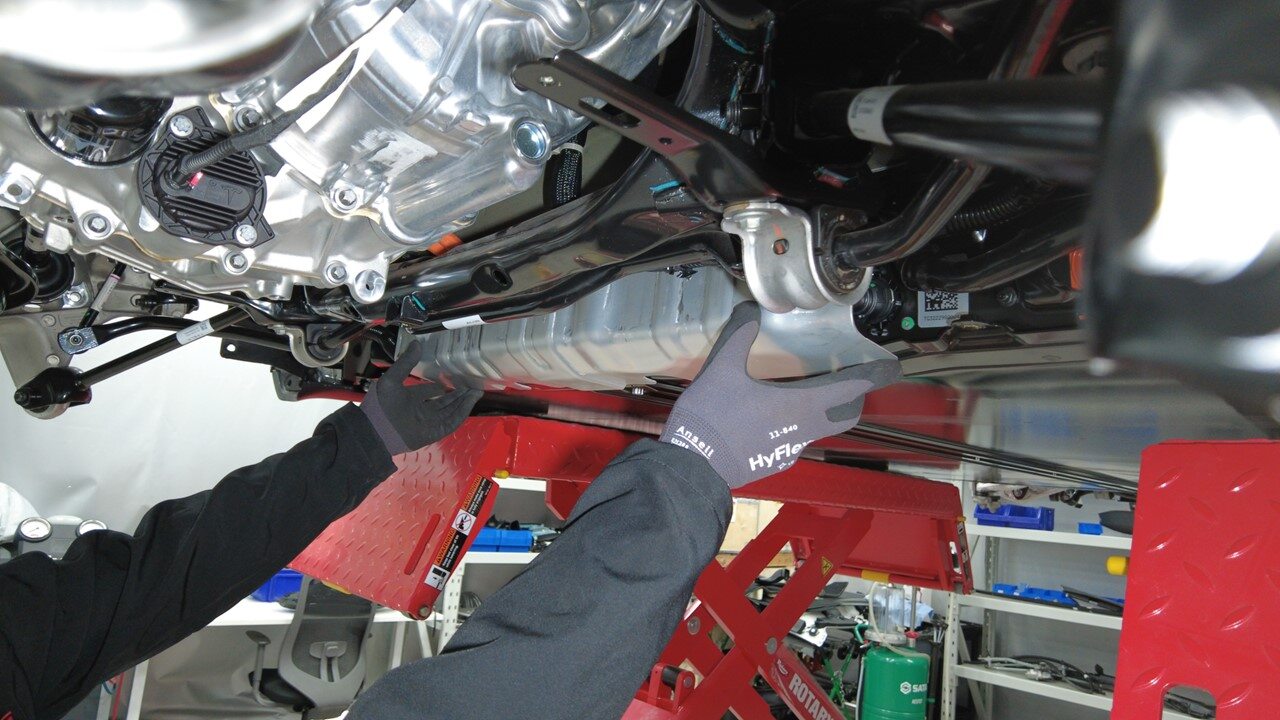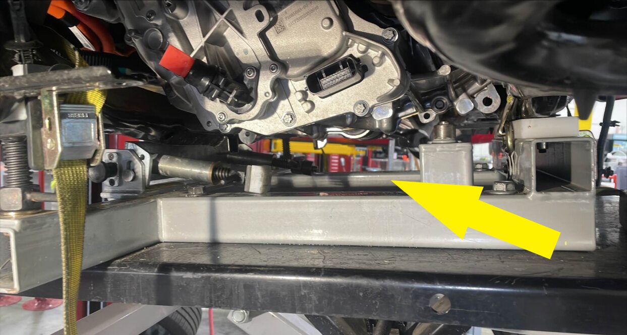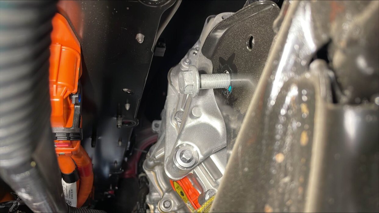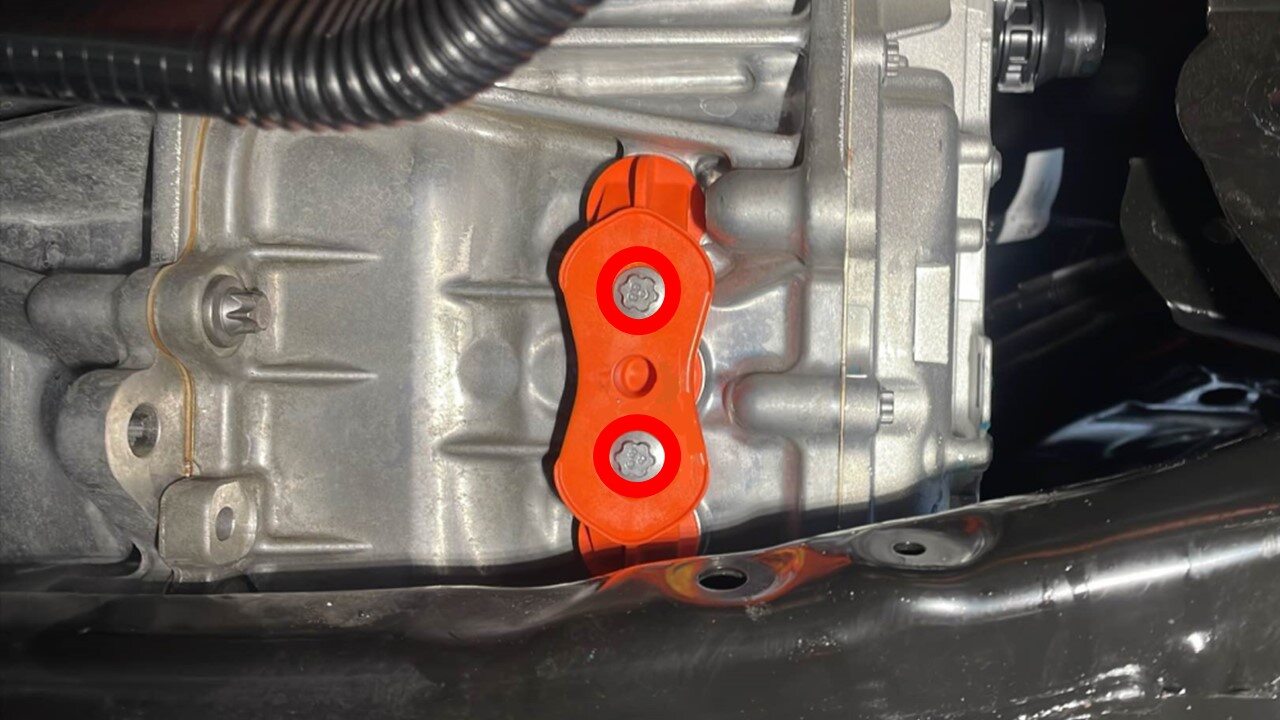 拆下用于固定高压电池外壳后滑板的下部螺栓。
