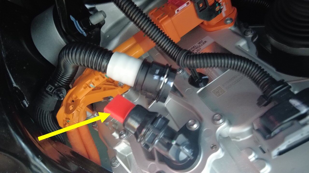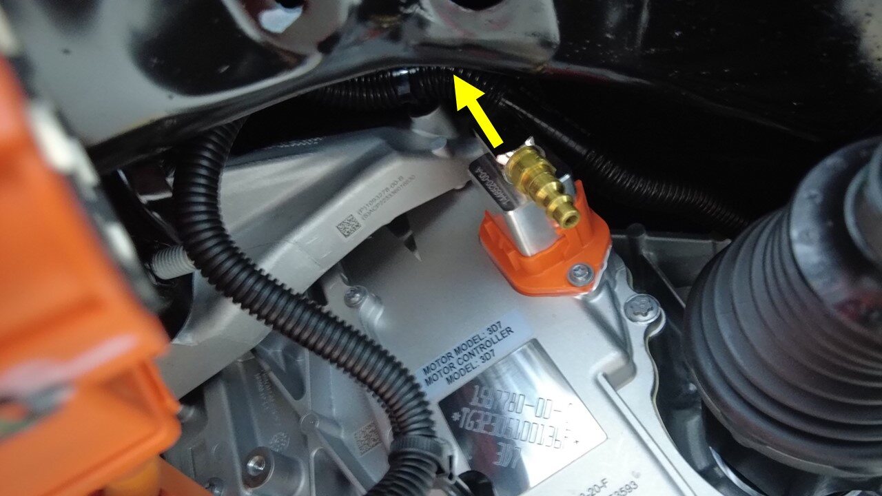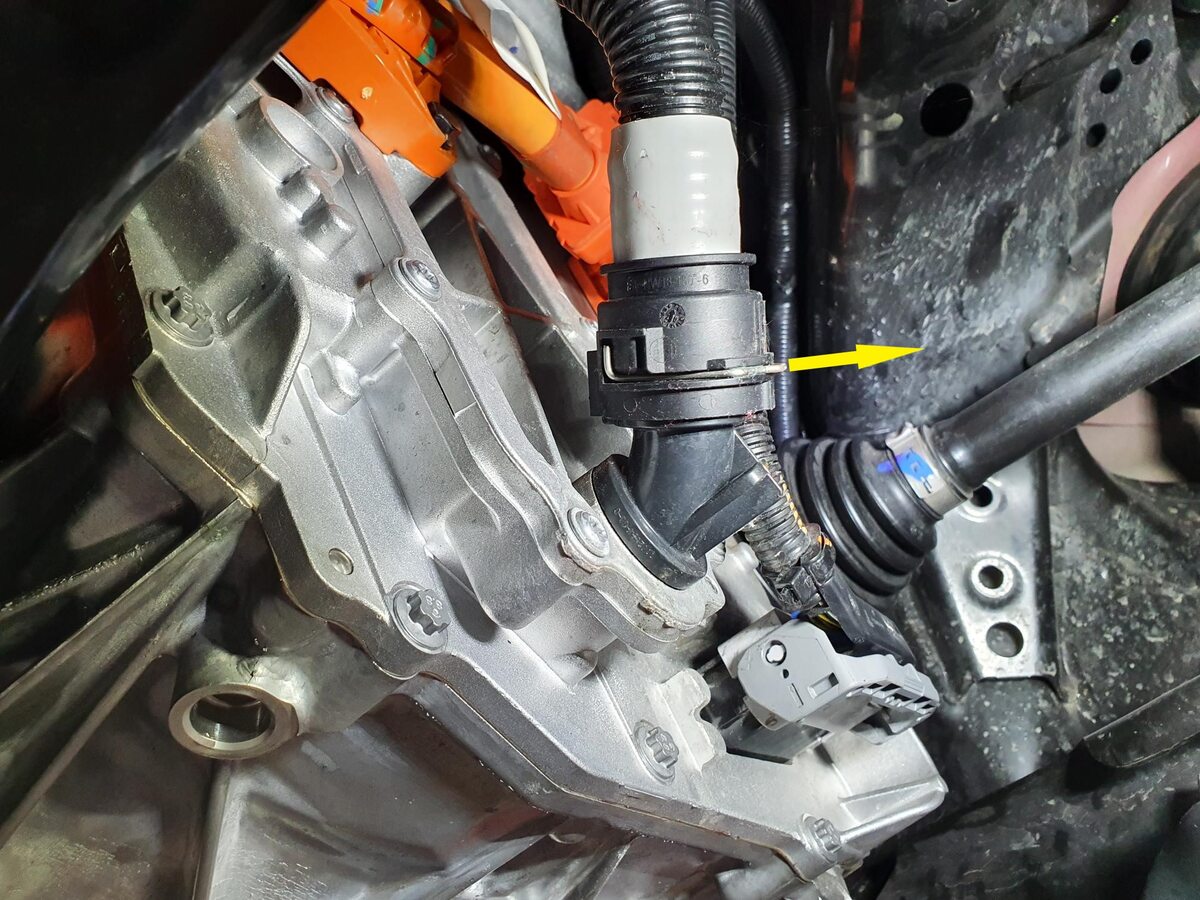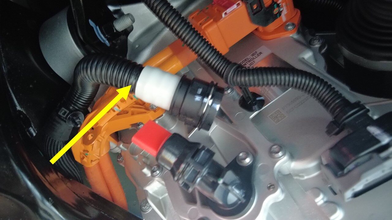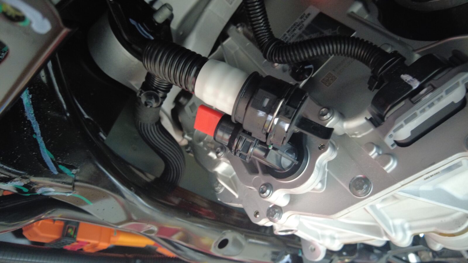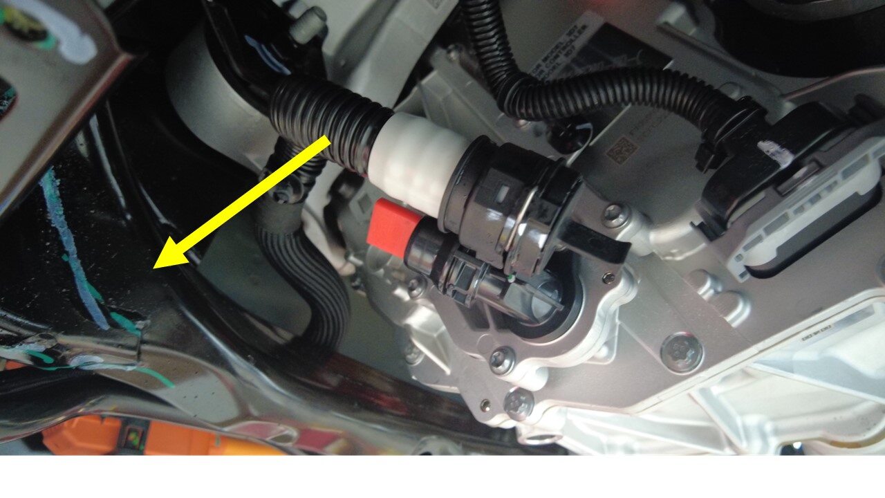 将后驱动电机变流器入口管从高压电池左后侧断开。