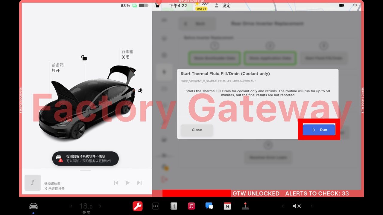 在 UI 界面上选择 "Run" 以“开始冷却液加注/排放”。