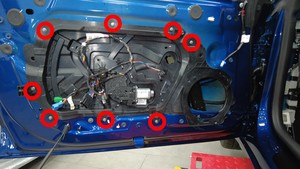 拆卸将左前车门封闭板固定到左前车门的螺钉(8 个)。