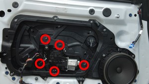 拆卸将左前车窗电机固定到左前车门封闭板的螺钉(5 个)。