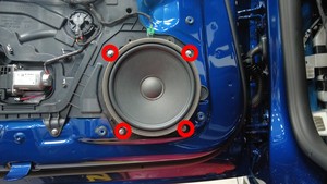 拆卸将前车门扬声器固定到左前车门的螺栓(4 个)和锁片(4 个),然后将扬声器拆下。