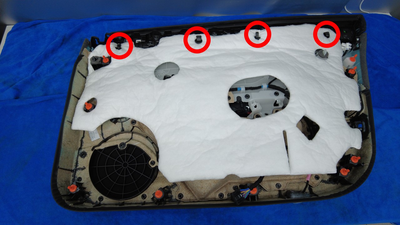 松开 NVH 垫锁片(4 个),将 NVH 垫从车门面板上拆下。