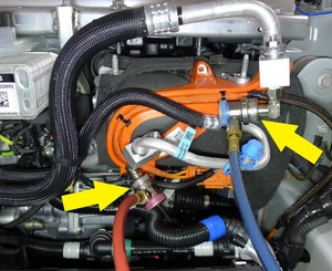 拆下将高压接头固定到空调压缩机的螺母,然后将软管总成置于一旁。