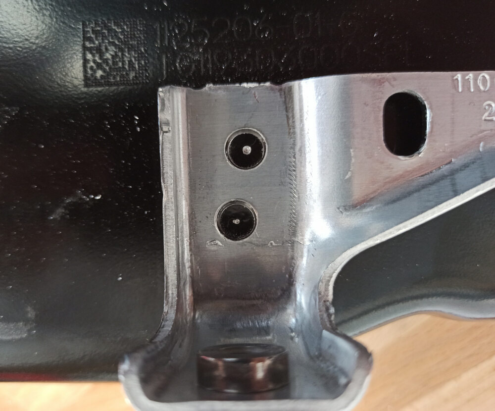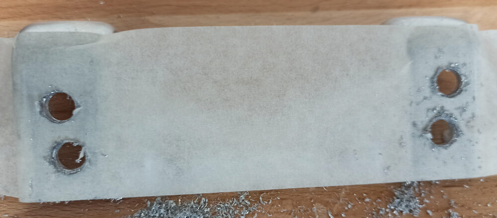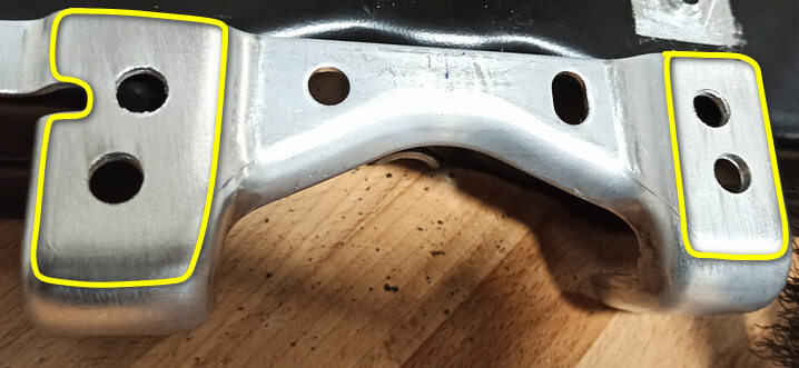 注Use 3/8" size spot weld cutter,Use chiseling technique at high speed to allow the chips to fly out as the cut exits the aluminum, or clean the cutter manually after short drilling, Drill to a depth of no more than the thickness of the Skid Plate Bracket approximately 2.5mm.