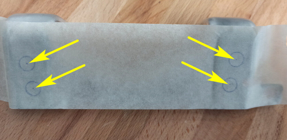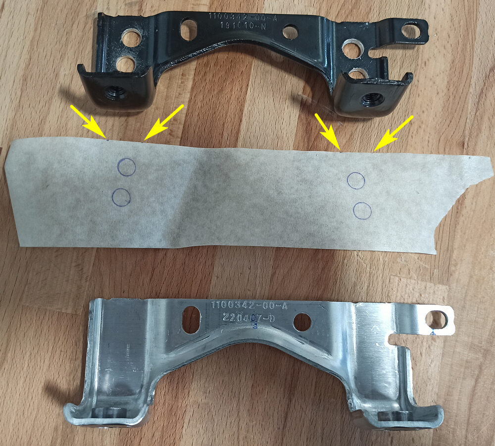 注Remove the stencil from the old bracket and apply it to the new one strictly in the same location. Use center punch to create a small dimple in the center of each circle.