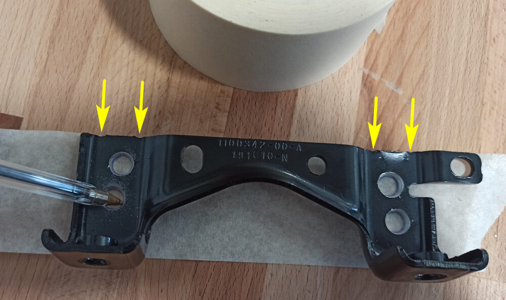 注Stick the masking tape on the old skid plate bracket along the top edge. Use thin ballpoint pen to mark the holes and the skid plate bracket location on a masking tape piece.