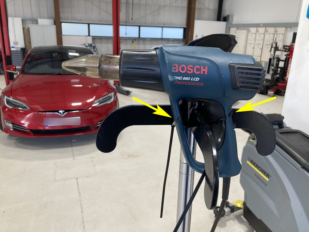 警告When force curing adhesive in a repair area near the High Voltage Battery, do not allow the High Voltage Battery to reach a temperature above 74°C (165°F). Heating the High Voltage Battery above 74°C (165°F) for an extended period could result in injury to personnel and/or damage to the battery. Attach the Bosch digitally adjustable temperature heat gun to the Transmission Jack with the zip ties. Install it facing the skid plate bracket 10 cm from it curing▪ 7 days at 23 ± 2 °C▪ 2 hours at 65 ± 2 °C.