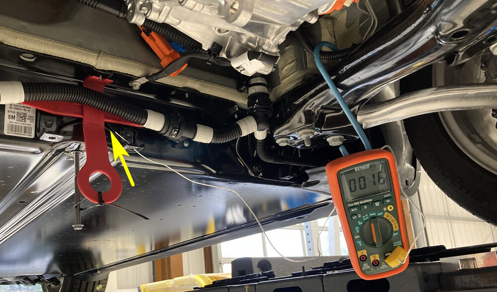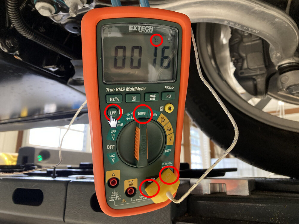 注Set up the Digital multimeter with thermocouple attached to it. Be careful with the polarity of the plug. Press LPF button to change from °F to C°. Turn switch to Temp position. Check if the temperature readings are real. Attach thermocouple to the skid plate.