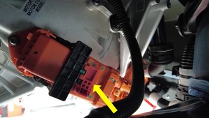 戴上高压绝缘手套,慢慢拉上释放把手,同时将前驱动单元高压线束连接器压入前驱动单元。