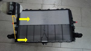 将散热器安装到冷却风扇和护罩总成上,然后安装将散热器固定到冷却风扇和护罩总成上的锁片(2 个)和固定支座(2 个)。