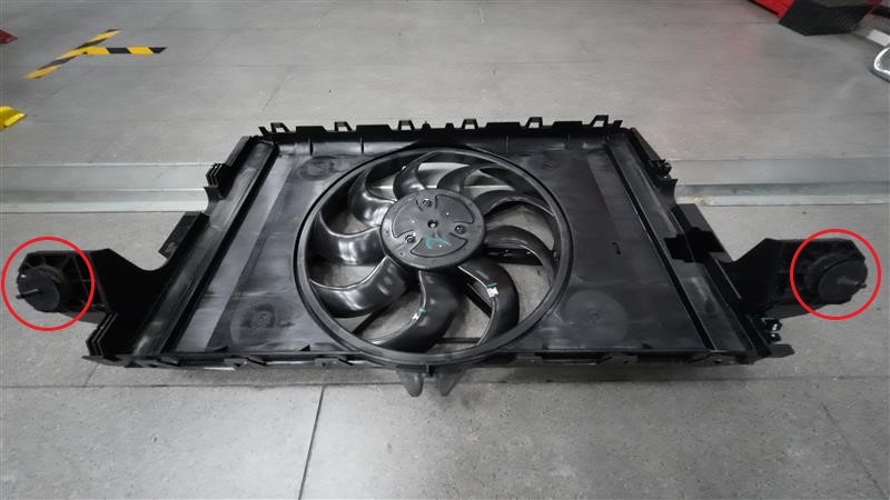 将螺栓(2 个)和隔离器(2 个)安装到冷却风扇和护罩总成上。